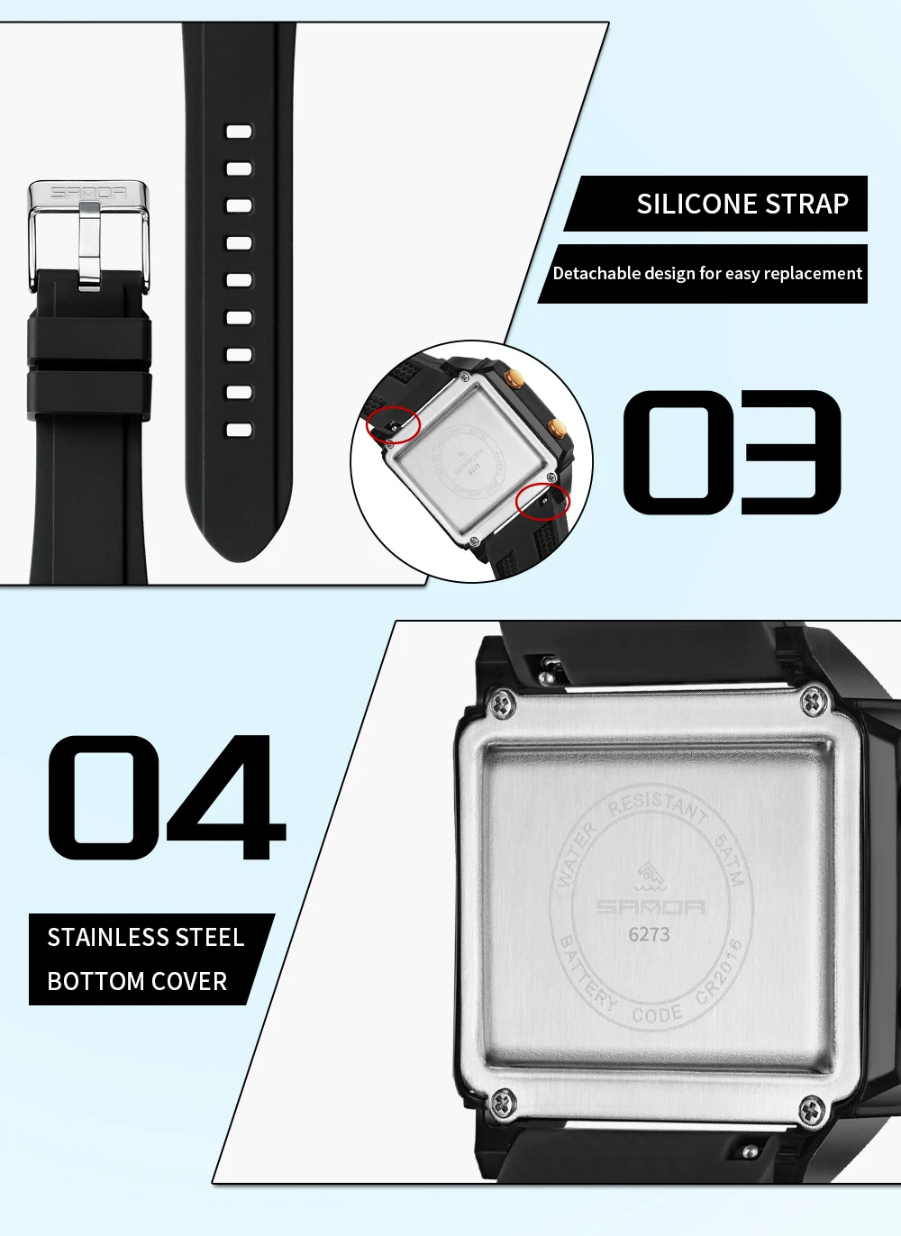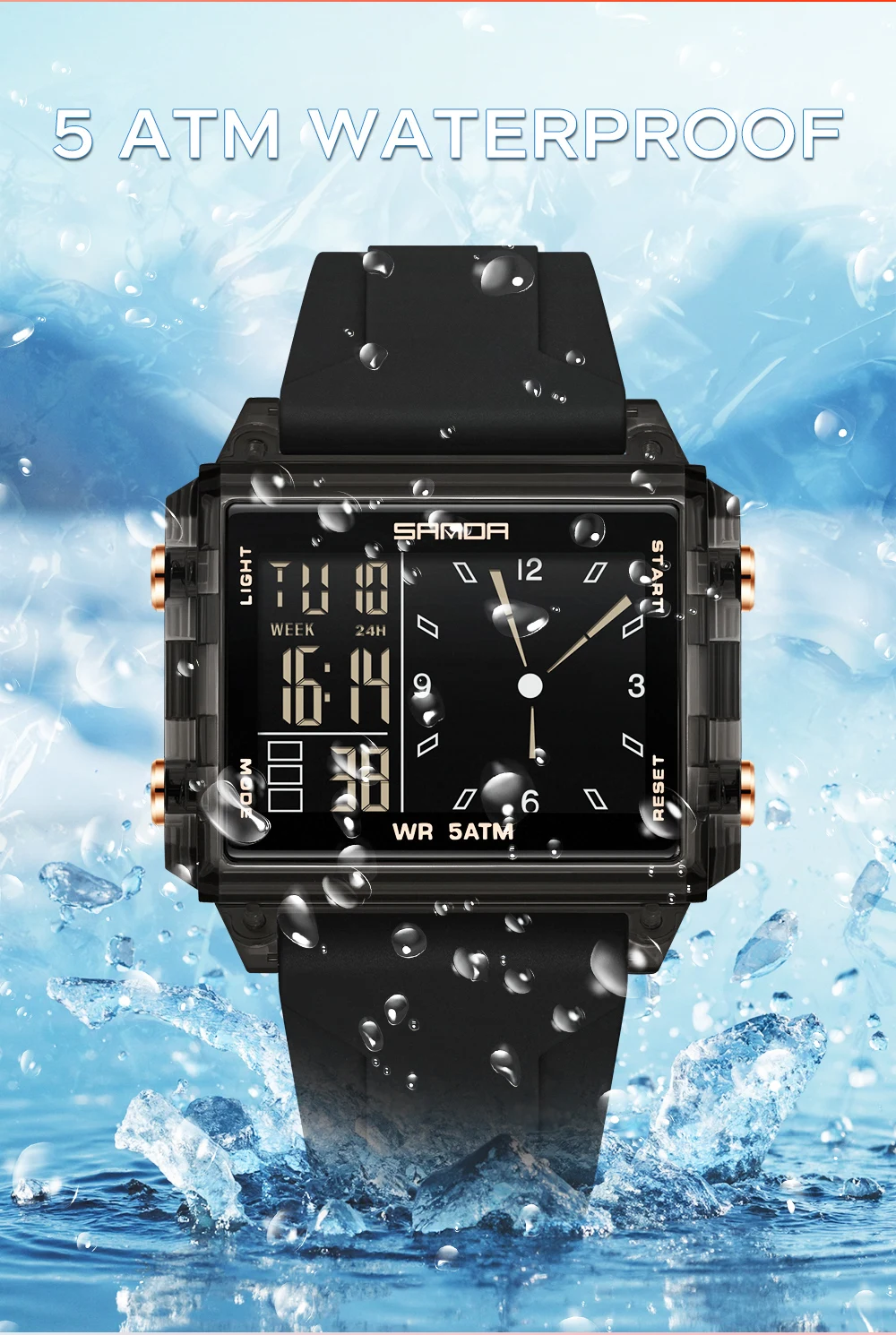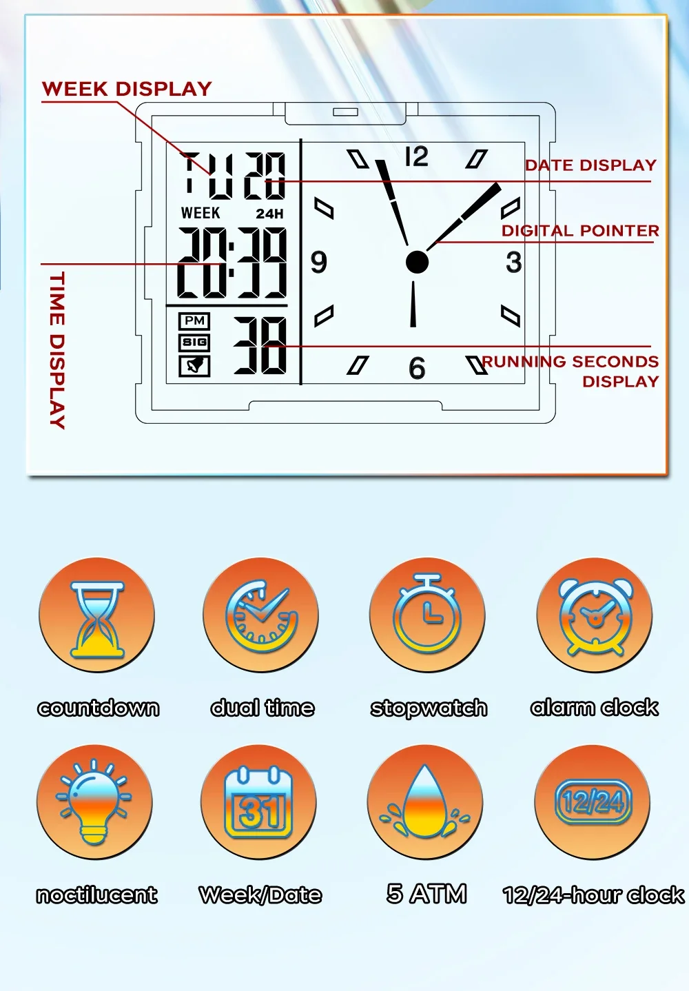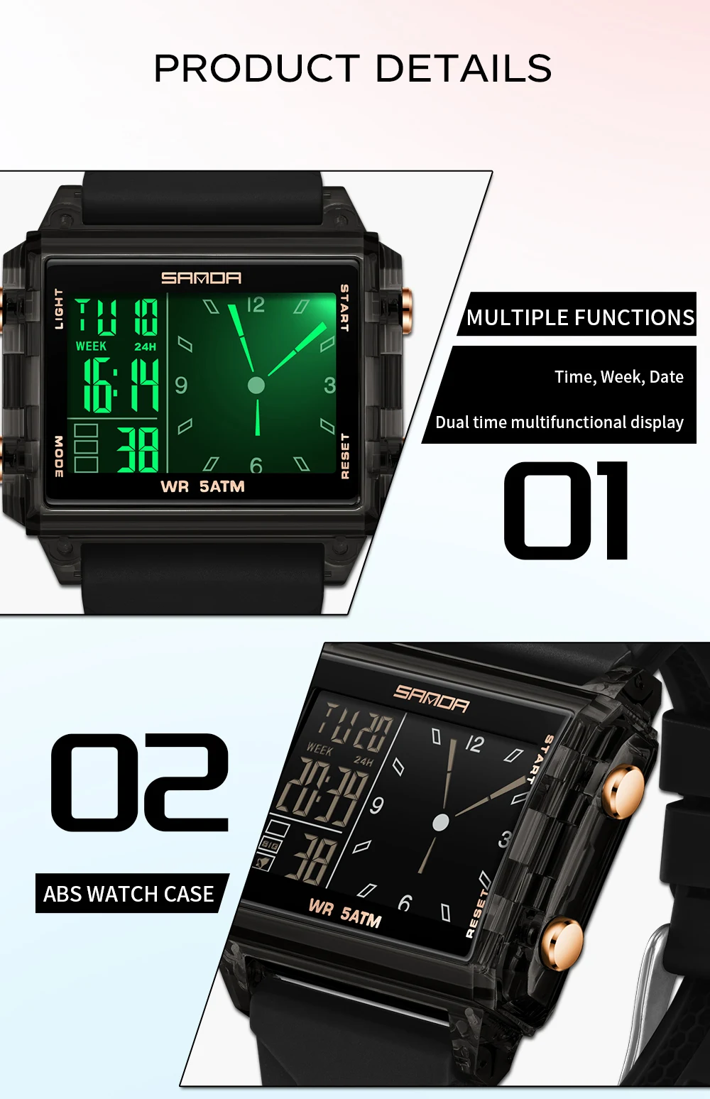 Brand: SANDAGender: U nisexDisplay: Digital/Electron AnalogCase Material:PlasticBand Material: TPUWatch band length Approx:26cmWatch band Width Approx:2.5cmWatch case diameter Approx: 4.55*3.5cmWatch case Thickness Approx:1.5cmProduct weight: 52g